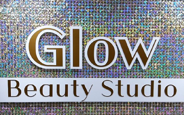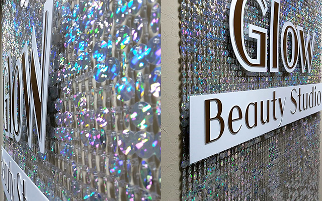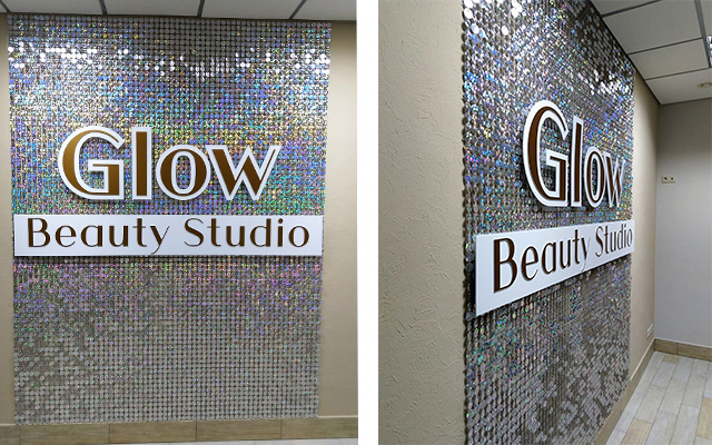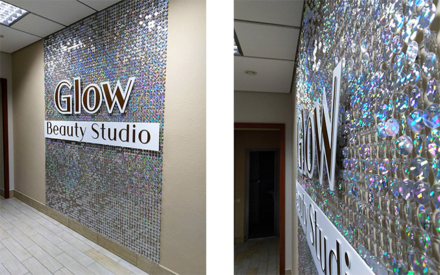 Динамические сверкающие панели были размещены в интерьере салона красоты GLOW в Минске в качестве постоянной фотозоны. Крепление панелей было осуществлено прямо на существующую стену. Цвет панелей - голографический топаз. Визуально такие пайетки выглядят как поверхность со множеством вкрапленных кристаллов Swarovski, каждая грань из которых традиционно играет своим собственным цветом.